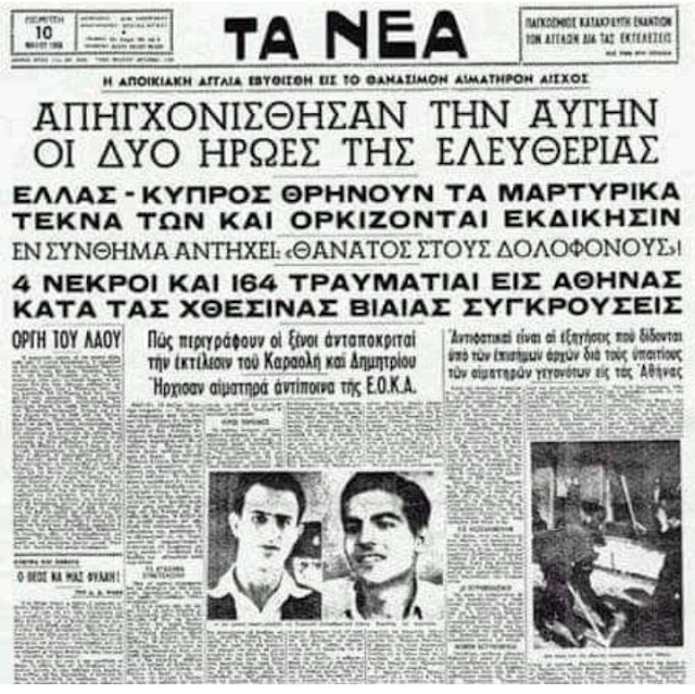 εκτελέσεως των Κυπρίων αγωνιστών Μιχαήλ Καραολή και Ανδρέου Δημητρίου :
