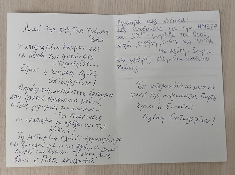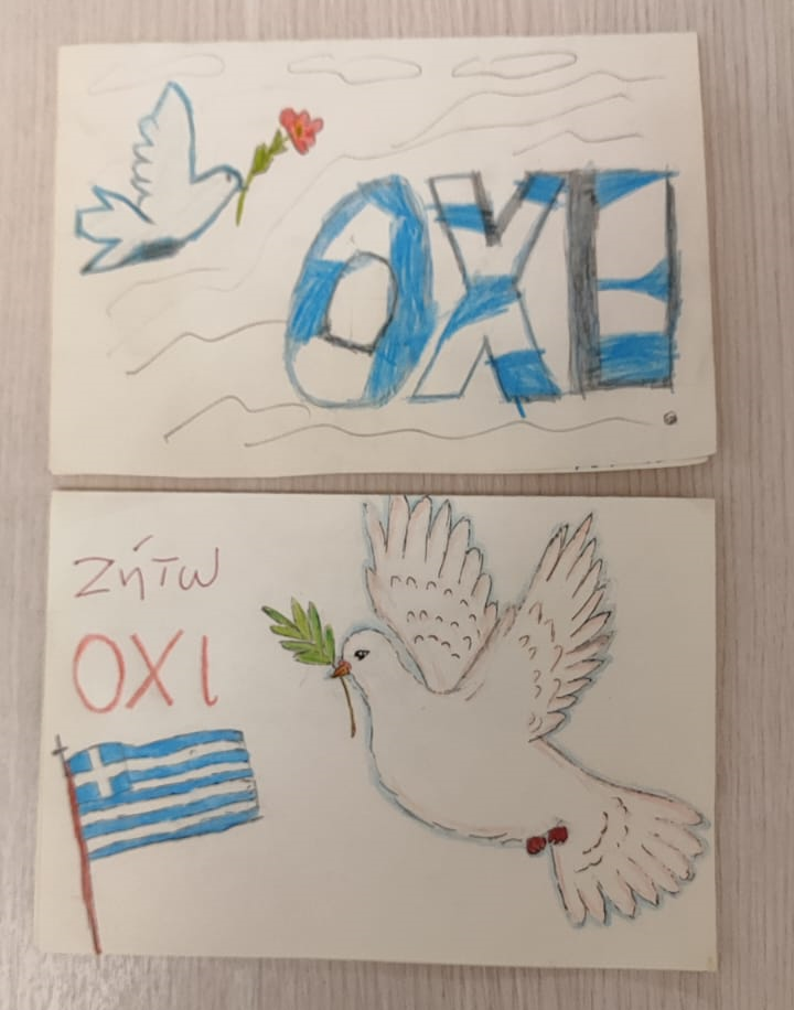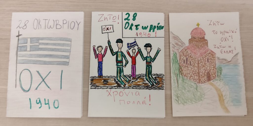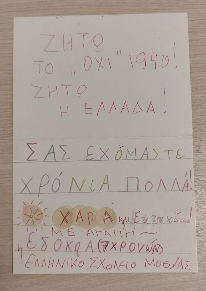 Σας στέλνουμε τις κάρτες τις οποίες ετοίμασαν οι μαθητές του Σχολείου Ελληνικής γλώσσας Ελληνικής Κοινότητας Μόσχας για την μεγάλη Εθνική Γιορτή την Ημέρα του ηρωικού ΟΧΙ! Ζήτω η Νίκη του 40! Ζήτω η ΕΛΛΑΣ!