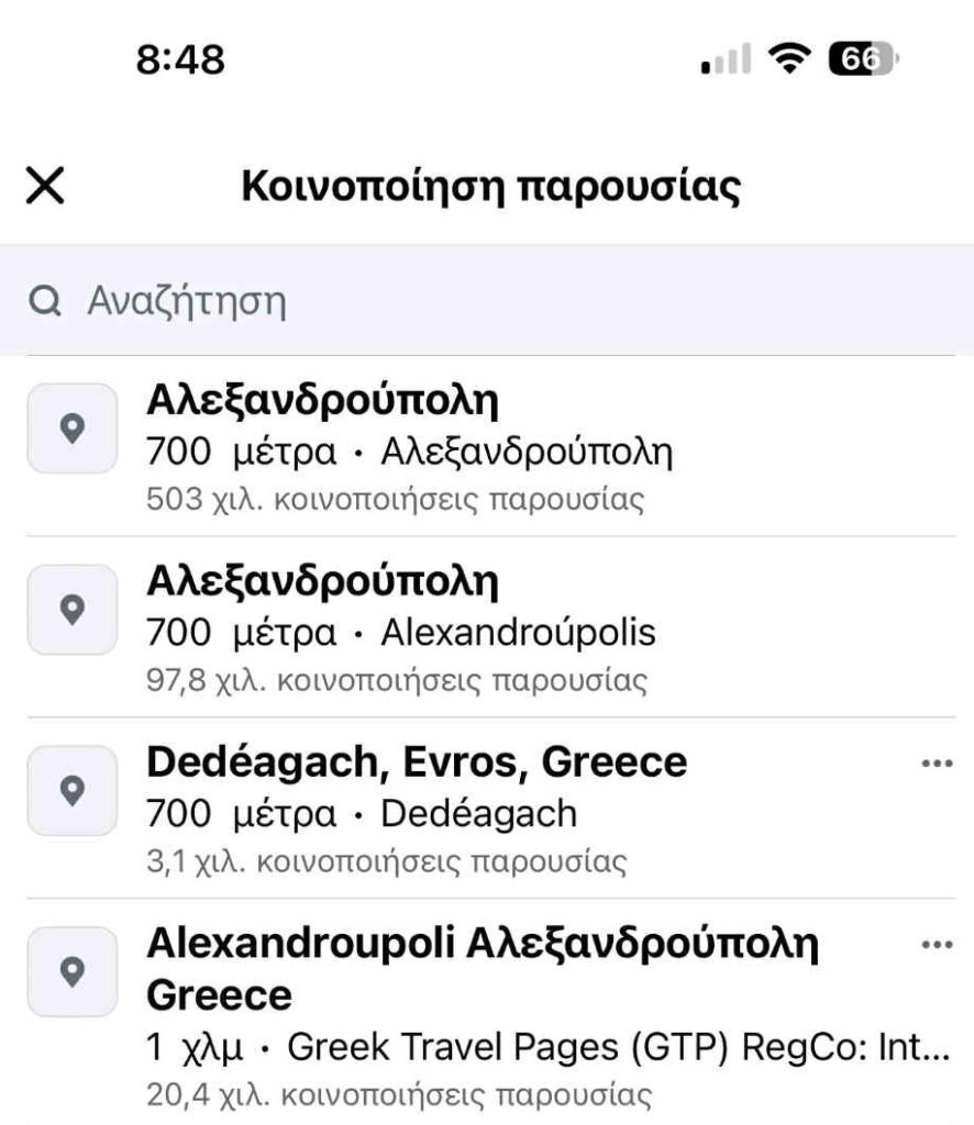 Στα κοινωνικά δίκτυα , Facebook και Instagram, μια ανησυχητική τάση έχει αρχίσει να προβληματίζει τους κατοίκους της Αλεξανδρούπολης: η τοποθεσία “Αλεξανδρούπολη” ή “Alexandroupoli” σιγά σιγά αφανίζεται, ενώ εμφανίζονται αντί αυτής οι ονομασίες “Dedeagach” (η τουρκική ονομασία της πόλης επί Οθωμανικής Αυτοκρατορίας) και “Aleksandroupoli”, με το “ks” που χρησιμοποιούν οι Τούρκοι αντί για το λατινικό “x”.