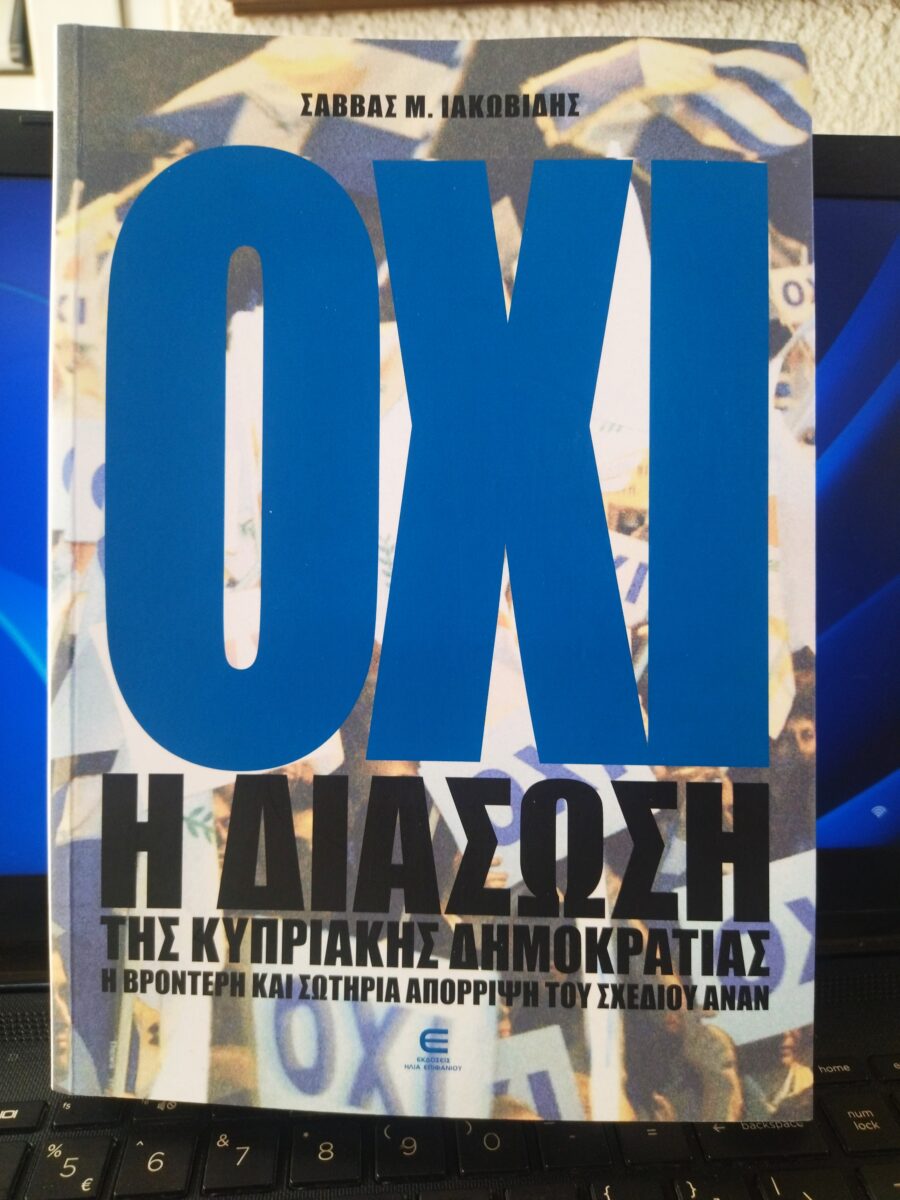 – Τίτλος του βιβλίου: «ΟΧΙ = Η Διάσωση της Κυπριακής Δημοκρατίας – Η Βροντερή και Σωτήρια Απόρριψη του Σχεδίου Ανάν». Από τις εκδόσεις Ηλία Επιφανίου, με 566 σελίδες. Το προλογίζουν ο Αρχιεπίσκοπος Κύπρου Γεώργιος και ο πανεπιστημιακός Παναγιώτης Ήφαιστος. Η δημόσια παρουσίασή του πραγματοποιήθηκε προχθές Παρασκευή 24η Απριλίου 2026, επέτειο του Δημοψηφίσματος, στη Δημοσιογραφική Εστία της Λευκωσίας, με ομιλητές τον πρώην Πρόεδρο της Βουλής Γιαννάκη Ομήρου και τον δικηγόρο Σίμο Ανδρέου Αγγελίδη.